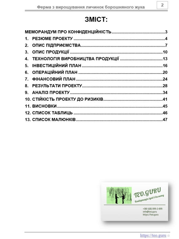 “Бізнес-план вирощування личинок борошняного жука хрущака інсектопротеїн протеїнове борошно. Перспективи і економічна ефективність розвитку бізнесу” складається з:
