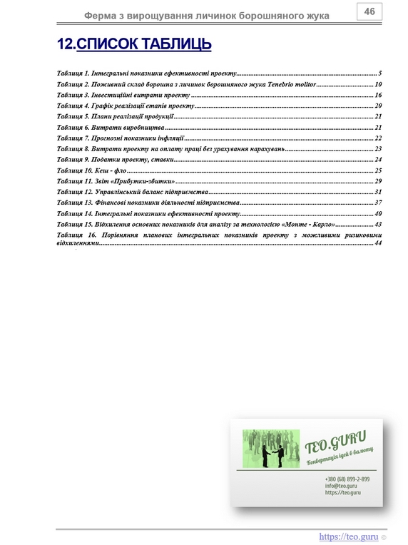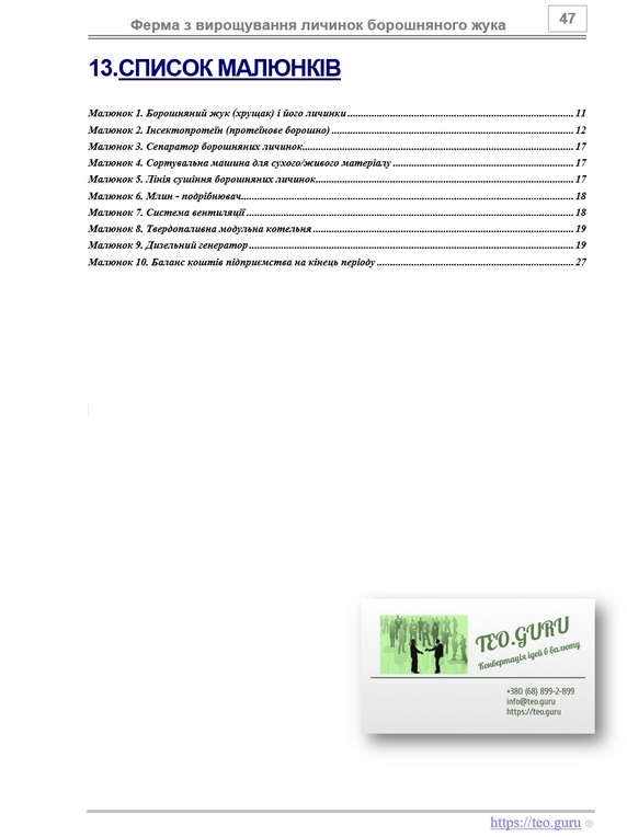 “Бізнес-план вирощування личинок борошняного жука хрущака інсектопротеїн протеїнове борошно. Технологія промислового вирощування і переробки борошняного червя – личинок жовтого мучника, борошняного хробака. Джерело протеїнів, мікроелементів, лауринової кислоти” дозволяє проаналізувати і порівняти з іншими видами бізнесу ефективність інвестицій в створення сучасної ферми, що виробляє високобілковий інгредієнт для комбікормової промисловості. Представлений бізнес-план – це готова, закінчена робота, яку можна не тільки придбати, а й пристосувати (перерахувати) до власних потреб (стратегії ведення бізнесу).
